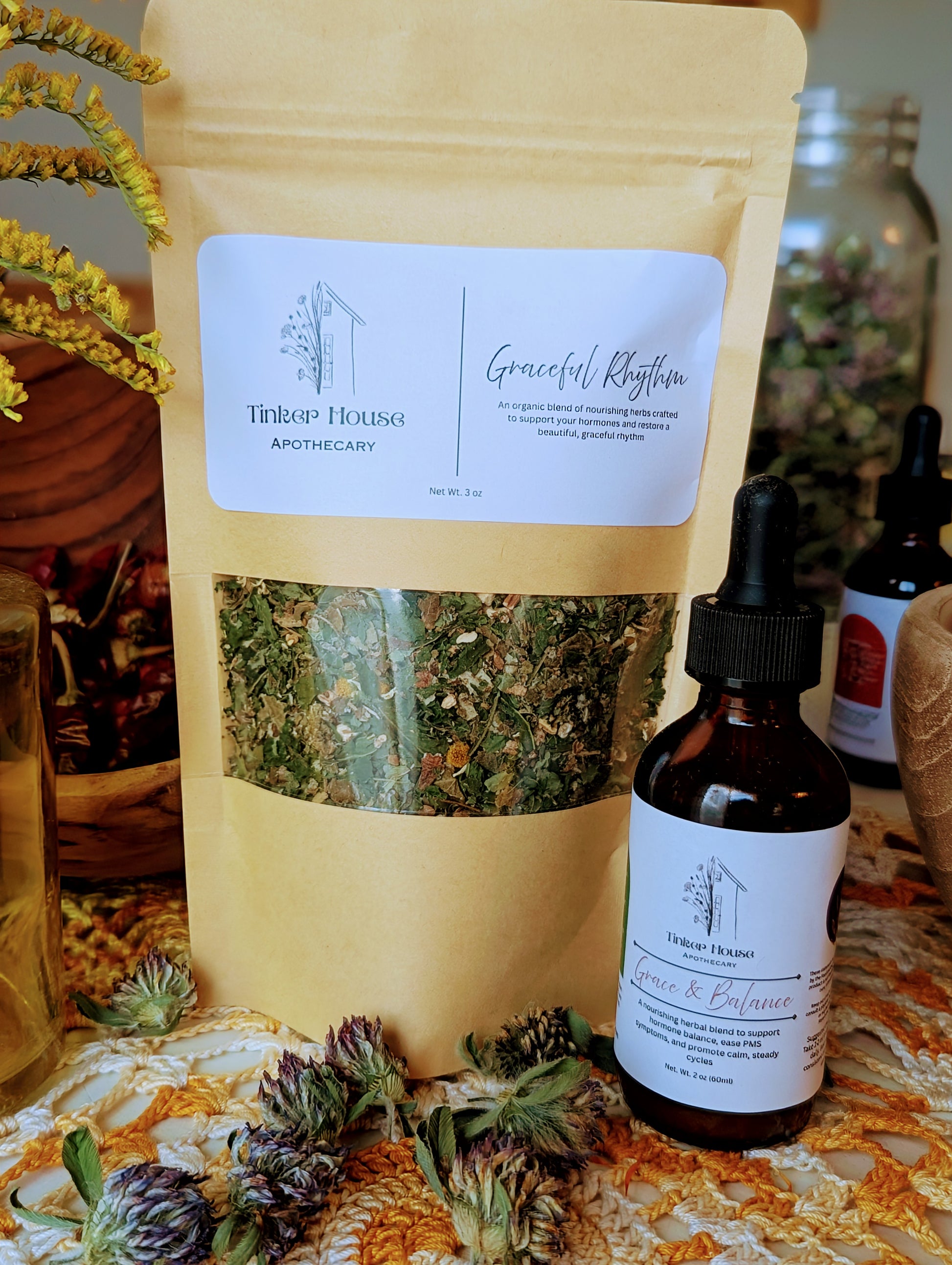 Taking a Grace and Balance tincture alongside Graceful Rhythm tea blend creates a powerhouse of herbal support because each preparation works in unique ways. Tinctures, made with alcohol or glycerin, extract and preserve the full spectrum of plant compounds—especially those that aren’t as soluble in water—offering fast-acting and concentrated support. Teas, on the other hand, provide a daily nourishing ritual that delivers hydrating, mineral-rich benefits, which alcohol extracts can’t capture as effectively. Our tea is rich in bio-available minerals like calcium, magnesium, iron, and potassium which are critical for hormone balance, muscle and nerve function, adrenal support, and steady energy.